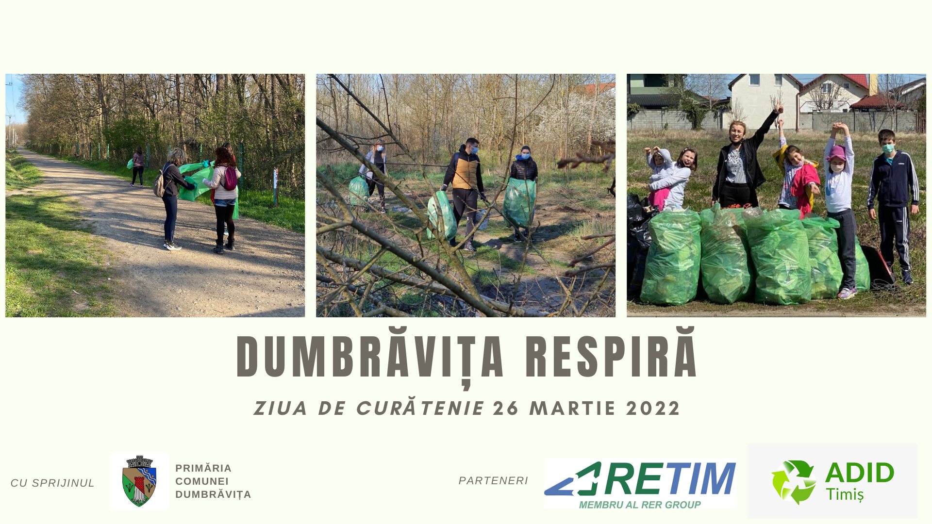 Toți locuitorii sunt invitați să ajute natura „să respire”. Evenimentul va avea loc în 26 martie cu începere de la ora 9.00 și este organizat de comunitatea „Dumbrăvița Curată”, împreună cu Retim Ecologic SA, primăria comunei și Asociația de Dezvoltare Intracomunitară Deșeuri Timiș.