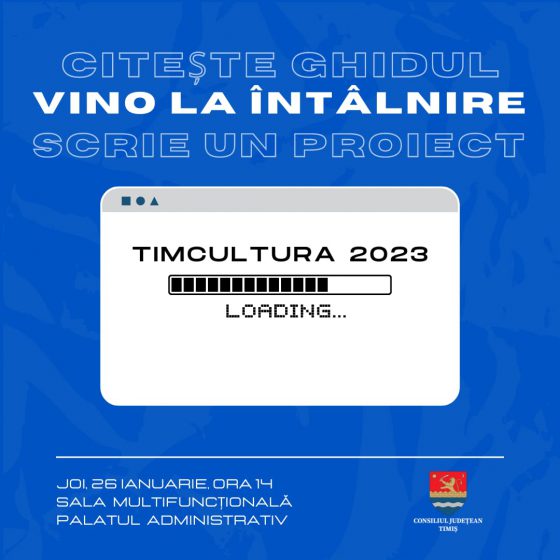 În vederea pregătirii demarării Programului TimCultura din anul 2023 și pentru o bună desfășurare a procesului de finanțare, Consiliul Județean Timiș organizează în data de 26.01.2023, ora 14.00, în Sala Multifuncțională a Palatului Administrativ, o sesiune de informare privind Ghidul de eligibilitate pentru finanțarea nerambursabilă din fonduri publice a proiectelor cultural – artistice și de tineret.