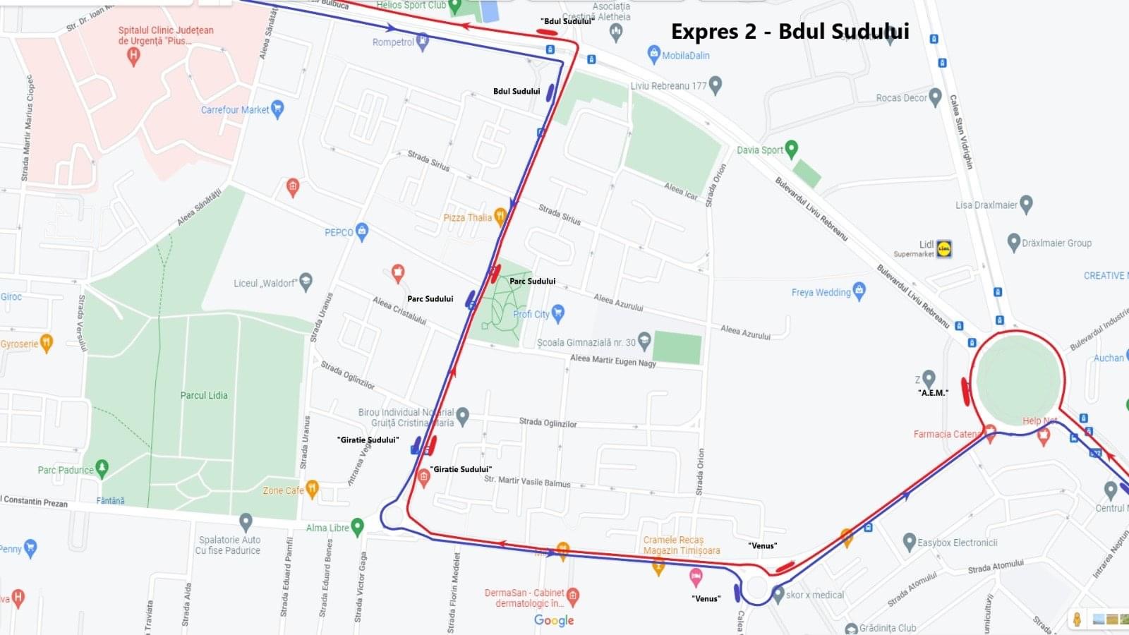 LINIA EXPRES 2 – traseu dus-întors: Continental – Piaţa Gheorghe Domăşneanu – strada Venus – bulevardul Sudului – bulevardul Dr. Iosif Bulbuca (bulevardul Liviu Rebreanu) – strada Arieş – Complexul Studenţesc – Bastion – Piaţa Mărăşti – Iulius Town – strada Sf. Apostoli Petru şi Pavel.